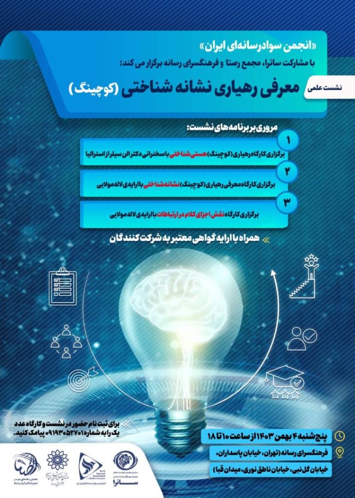 مدیر روابط عمومی انجمن سواد رسانه ای ایران گفت: «انجمن‌ سوادرسانه‌ای ایران» با مشارکت معاونت کاربران و تنظیمگری اجتماعی ساترا، مجمع رصتا و فرهنگسرای رسانه، نشست علمی «معرفی رهیاری (کوچینگ)» را پنجشنبه، چهارم بهمن در فرهنگسرای رسانه برگزار می کند.